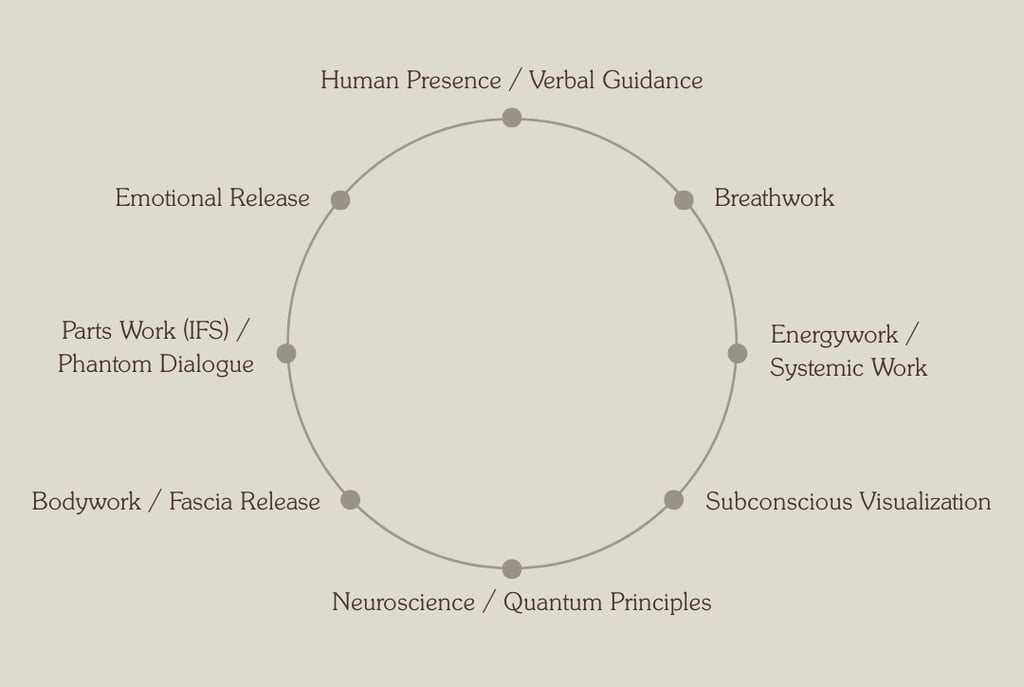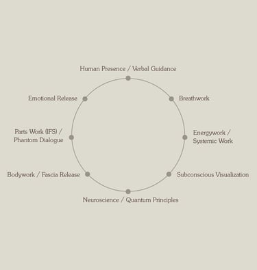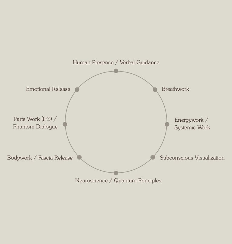 This wheel represents an integrated, trauma-informed approach grounded in neuroscience, somatics, and psychodynamic work.